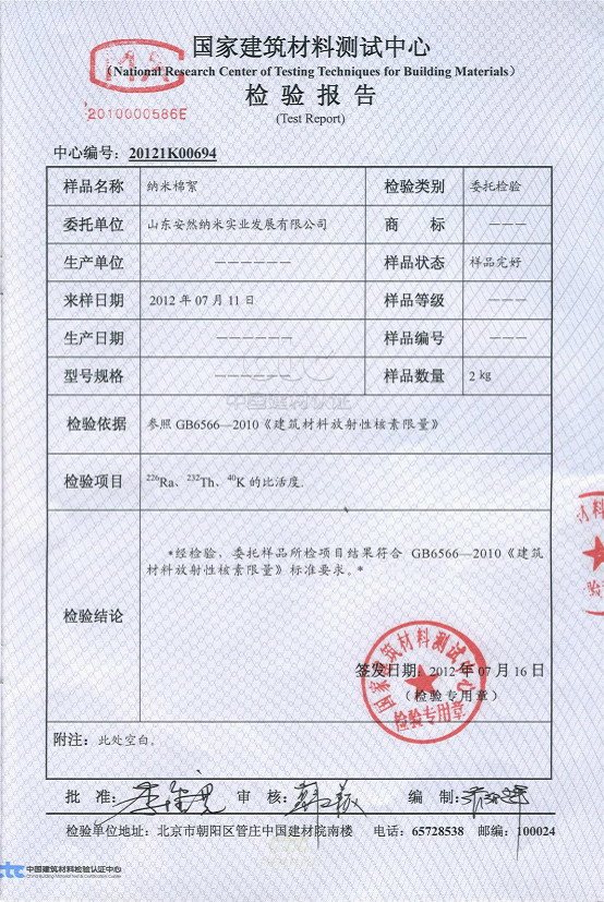 安然微元生化紡織品自上市以來,以顯著的功效贏得了廣大消費者的青睞。為樹立品牌形象,幫助伙伴更好的開拓市場,安然公司近日委托國家建筑材料檢測中心對安然納米微元生化紡織品的原材料——納米布料和納米棉絮進行了放射性核素的檢驗。經檢測,安然納米布料和納米棉絮的226Ra(鐳—226)、232Th(釷-232)和40K(鉀-40)的比活度完全符合國家相關要求,產品無放射性。