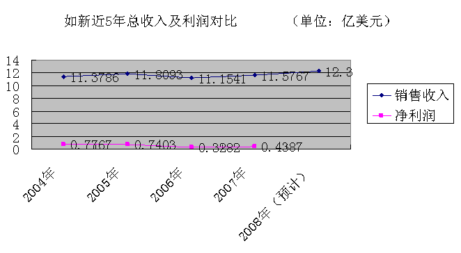 可以看到,如新2008年上半年在大中華區的總收入為1.57億美元,在中國大陸的業績銷售下滑得比較嚴重