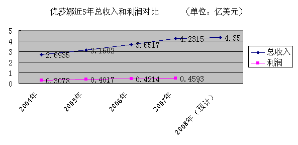 截至2008年6月28日,優莎娜公司上半年較去年上半年上升了1.2%,實現銷售凈額2.108億美元(去年同期為2.082億美元)。