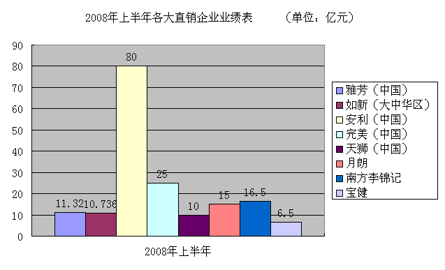 從2008年上半年各大直銷企業的業績表中可以看出,安利完美仍然穩坐國內直銷企業的第一和第二把交椅,老牌民族企業南方李錦記悄悄占據著第三的份額,新興企業月朗的增長不容小覷,已經超越雅芳、天獅、如新等大牌企業的業績,升到了前五強的位置。