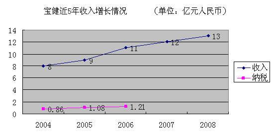 這個低調潛行的企業,只能從它每一年的納稅額,來推算它的業績。2004年,寶健上交稅款為8630萬元, 2005年達到1.08億元人民幣,2006年則達到了1.21億元,《中國直銷》曾給寶健2005年—2007年的業績分別評估為9億元、11億元、12億元。