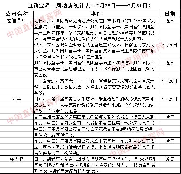 當(dāng)前位置:新聞資訊首頁 >> 行業(yè)動(dòng)態(tài) >> 直銷界一周動(dòng)態(tài)統(tǒng)計(jì)表(7月25日—7月31日)