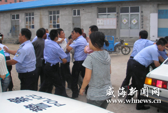 當日下午1時許,記者聞訊趕到文登市公安局工商派出所時看到,一伙青年男女正站在派出所門口指手劃腳,吵吵嚷嚷。30多分鐘后,所內一名工作人員外出時遭到這伙人的強行阻攔。巡邏民警和趕來的環山派出所民警制止了這些人員的行為,并將現場的19名男女帶回審查。