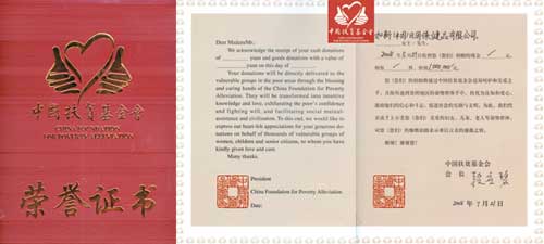 如新集團,在大災面前,表現出的這一份愛心,加強了身處災難之中的同胞重建家園的信心與斗志,中國扶貧基金會特此頒發此證書,以鼓勵如新集團這一善舉。