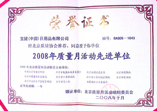 2008年10月,寶健(中國)日用品有限公司,經(jīng)北京質量協(xié)會推薦,被北京質量月活動組委會授予2008年質量月活動先進單位。