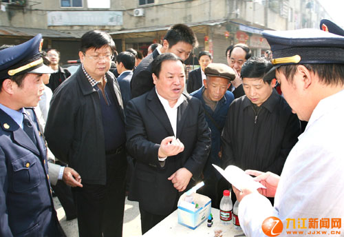 國家工商總局局長周伯華(中)在熊盛文、陳安眾等省市領導陪同下,來到京九批發市場考察調研。