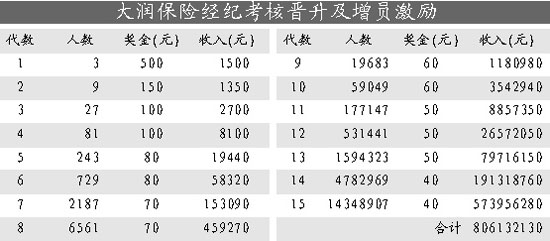 “目前保險中介發(fā)展不成熟,雖然號稱保險超市,其實很多保險公司并不會把一些很好的產(chǎn)品給中介公司來賣。大潤基本上沒有很好的產(chǎn)品可賣,只有卡單可做,這樣造成了大潤只能靠拉人頭賺下線的錢的方式來發(fā)展,從而造成經(jīng)營上的混亂。”王君認為,“雖然各保險公司也有類似團隊增員的計劃,但是大潤的做法和其他保險公司根本不一樣:大潤業(yè)務(wù)經(jīng)理以下職級晉升的時候沒有業(yè)務(wù)的考核,只有人力的考核,這有悖保險銷售的初衷。”