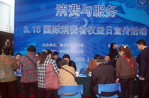 盡管今天細雨綿綿,但重慶市民關注“3.15”的熱情絲毫未減退。由渝中區(qū)工商分局、解放碑工商所和安利重慶分公司等共同設立的宣傳點成了市民們咨詢消費者權益和了解安利等商品的聚集點。