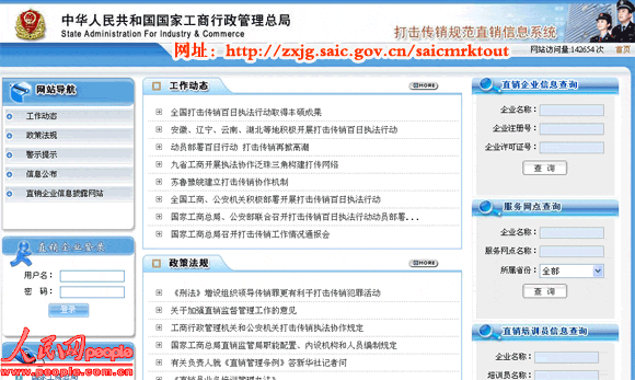 | 國家工商總局網(wǎng)站的“打擊傳銷規(guī)范直銷信息系統(tǒng)”截圖,圖中網(wǎng)址為人民網(wǎng)截圖后所加 |