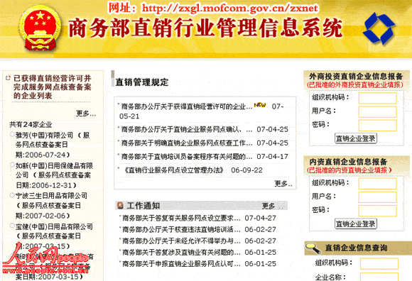 | 國家商務(wù)部網(wǎng)站的“直銷行業(yè)管理信息系統(tǒng)”截圖,圖中網(wǎng)址為人民網(wǎng)截圖后所加 |