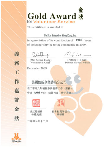 如新集團香港分公司憑借“善的力量”企業文化理念,以及一直不遺余力的履行社會責任,長期參與各項慈善活動,第4次榮獲香港社會福利署頒發義務工作嘉許金狀,以表揚銷售伙伴及行政員工上下一心積極行善,于2009年的服務社會時數高達4,960.5小時。