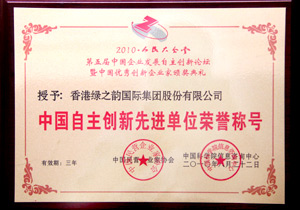 2010年8月22日,由中國民營企業(yè)家協(xié)會、中國經(jīng)濟(jì)社會發(fā)展研究會等單位共同舉辦的“第五屆中國企業(yè)發(fā)展自主創(chuàng)新論壇暨中國優(yōu)秀創(chuàng)新企業(yè)頒獎典禮”在人民大會堂召開。綠之韻集團(tuán)榮獲“中國年度創(chuàng)新企業(yè)”、胡國安董事長榮獲“中國企業(yè)年度創(chuàng)新人物”榮譽(yù)稱號,綠之韻國際市場運營副總裁李繼前出席會議并代表企業(yè)接受頒獎。