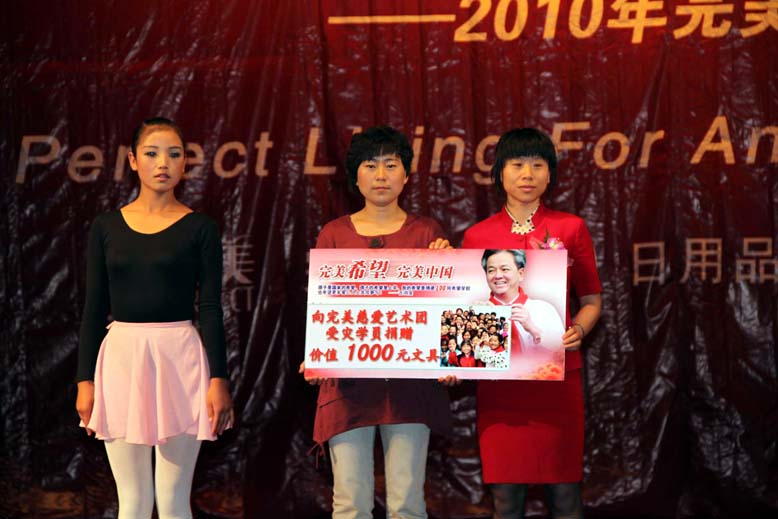 慈善捐贈(zèng)儀式中,分公司工會(huì)主席曹永霞女士,代表分公司全體員工,將分公司為藝術(shù)團(tuán)中受災(zāi)學(xué)生買的學(xué)習(xí)用品,交到慈愛(ài)藝術(shù)團(tuán)苗主任手中。業(yè)務(wù)支援部譚經(jīng)理把完美公司的愛(ài)心捐款及甘肅省專賣店經(jīng)理的個(gè)人捐款共4萬(wàn)多元送到隴南成縣受災(zāi)完美伙伴代表手中時(shí),捐款儀式現(xiàn)場(chǎng)已經(jīng)達(dá)到了高潮,熱烈的掌聲,久久未停。