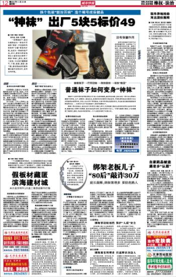 一雙普通襪子,經過包裝竟成為一種治療百病的“神襪”,不僅擁有各種醫學“文獻”背景和療效,還成為一種高科技產品。近日,家住河西區的張女士就花98元購買了兩雙“神襪”。然而,張女士發現,可以治療緩解腳氣、汗腳、腳臭、腳麻、腳干裂、腳涼等癥狀的宣傳噱頭破滅在使用中,沒有任何療效。