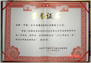 如新優異的企業文化及誠信的經營理念,贏得了新疆自治區工商管理等部門的高度認可和贊許, 近日新疆烏魯木齊市工商行政管理局授予如新中國新疆分公司2009-2010年度“守合同 重信用”企業,旨在表彰如新在規范市場經濟秩序,完善企業信用體系建設,推進企業誠信,營造和諧安全的市場環境方面所作出的貢獻和成績。
