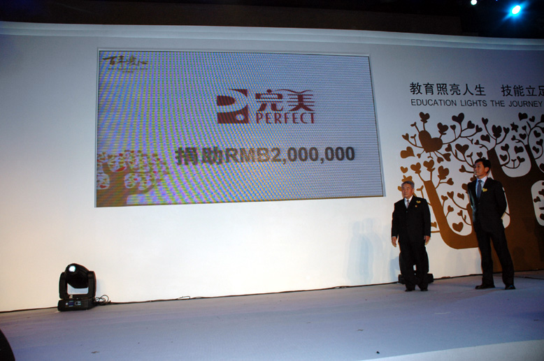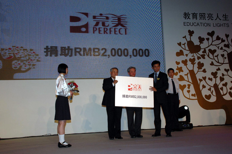 2010年6月,古潤金董事長在“揚州完美日用品有限公司開業典禮”上宣布為百年職校捐助人民幣2,000,000元人民幣,成為本年度百年職校收到金額最大的捐贈之一。愛心慈善晚宴現場,在參會嘉賓的共同見證下,古潤金董事長向百年職校理事、中國青少年發展基金會涂猛秘書長和百年職校首任校長、清華大學王作垣教授遞交了捐贈牌,將完美“僑商公益、四海同心”的企業社會責任理念展現無遺。此外,完美(中國)日用品有限公司還通過晚宴購票向百年職校捐款8.8萬元人民幣,并捐贈完美蘆薈膠800支,完美牌壓榨山茶籽油80瓶。