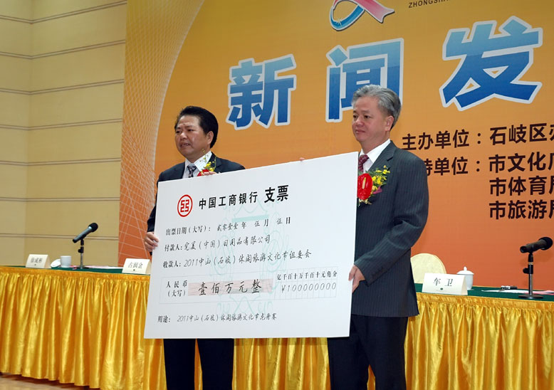 5月5日,石岐區辦事處、市文化廣播電視新聞出版局、市體育局、市旅游局等單位聯合舉辦新聞發布會,對一年一度的商業文化盛會進行了推介。完美(中國)有限公司總部就坐落在石岐區,每年都大力支持和踴躍參與休閑旅游文化節。今年,公司再次向石岐區捐贈100萬元,舉辦“完美杯”龍舟賽。古潤金董事長代表公司出席了在中山金鉆酒店舉行的“新聞發布會”,并向石岐區黨工委副書記、辦事處主任甘建仁移交了100萬元捐贈支票。