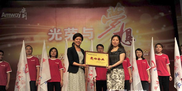 成都市血液中心副主任傅雪梅(右)向安利四川分公司贈送“愛心企業”獎牌。