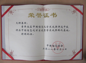 2011年7月8日,由中國信息協會主辦的“第二屆中國信息界學術大會暨中國信息化學術成果頒獎典禮”在青島舉行。會議揭曉了“中國信息化優秀學術成果轉化基地”獲獎名單,并舉行了隆重的頒獎典禮。