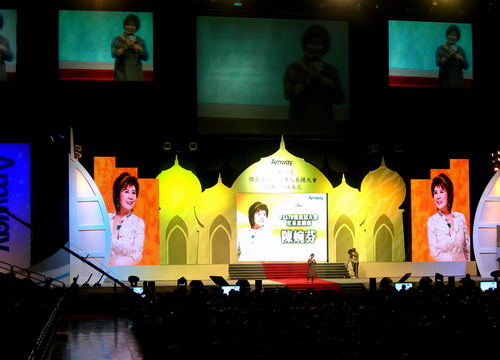 在這場表揚會的會場來了超過1萬人,會中臺灣安利總經理陳惠雯表示,安利年度業績結算月是在9月,而截至8月初臺灣安利年度業績已成長了9.3%,非常有希望到達所設定的10%的目標。同時,安利公司提出了諸多的措施來獎勵表現絕佳的直銷商們,例如前往巴利島、杜拜等地的招待旅游計劃,接著表揚了28戶直系直銷商、3戶紅寶石直系直銷商、1戶明珠直系直銷商、1戶藍寶石直系直銷商以及1戶翡翠直系直銷商。最后的高潮時刻,公司特別邀請了皇冠大使直系直銷商鐘易宏先生,以及在安利有華人之光之稱的FAA70雙皇冠大使直系直銷商陳婉芬女士來分享他們在安利經營的心得及感言,特別是陳婉芬女士出場時,更是令全場安利人目不轉睛、全神貫注地聆聽及寫筆記,當她用那平易近人的口語深入淺出地分享時,更是使所有的與會者起立鼓掌表示感動!