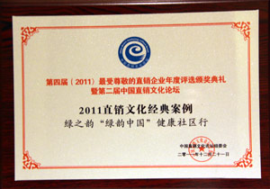 會上,綠之韻集團憑借八年來規范自律、回饋社會的企業宗旨,榮獲“2011最受尊敬的直銷企業”及“2011企業文化建設成就獎”;“綠韻中國”健康社區行活動榮獲“2011直銷文化經典案例獎”;綠之韻集團企劃新聞部榮獲“金雁獎—最佳企劃獎”,綠之韻河北辦事處業務主任趙軍代表出席接受頒獎。此外,綠之韻高級經銷商徐華憑借卓越的領導能力榮獲“2011最受尊敬的直銷領袖”、“2011年度直銷形象大使”、“金雁獎—最佳忠誠獎”,綠之韻華晨系統被評為“2011最受尊敬的直銷系統”。