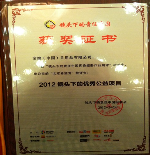 本次活動(dòng)為記錄企業(yè)履行社會(huì)責(zé)任、傳播健康向上的公益文化而舉辦。經(jīng)過(guò)近半年的網(wǎng)上投票評(píng)比、信息真實(shí)性調(diào)查、媒體評(píng)審委員會(huì)投票評(píng)選,寶健被評(píng)為“2012鏡頭下的責(zé)任企業(yè)”,“寶健北京希望營(yíng)項(xiàng)目”被評(píng)為“2012鏡頭下的優(yōu)秀公益項(xiàng)目”。這兩項(xiàng)公益大獎(jiǎng)的獲得,不僅是對(duì)寶健履行優(yōu)秀企業(yè)公民責(zé)任的一種鼓勵(lì),更是對(duì)包括寶健代理商及員工在內(nèi)的所有寶健1%愛(ài)心志愿者的一種嘉獎(jiǎng)!