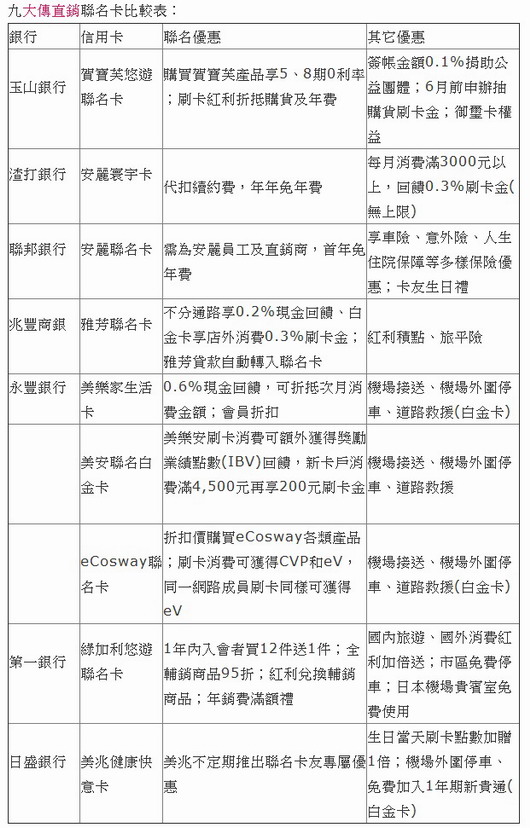 據記者側面了解,2010年臺灣地區前五大傳直銷公司依序為安麗(82億,約人民幣17.47億元)、賀寶芙(62億,約人民幣13.2億元)、美樂家(58億,約人民幣12.35億元)、雅芳(46.4億,約人民幣9.88億元)及如新(37億,約人民幣7.88億元),幾乎都有跟銀行合作發行聯名卡。若從銀行來看,則是以永豐銀行最為積極,旗下包含"美安聯名白金卡"、"美樂家生活卡"、"eCosway聯名卡"等3張。