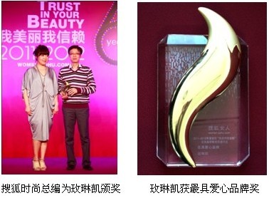 2012年3月9日,搜狐女人2011-2012年度“我美麗我信賴化妝品評選”頒獎盛典在上海隆重舉行,玫琳凱中國以超高的公眾人氣和品牌形象被三千萬網(wǎng)友推選為最具愛心品牌。搜狐時尚總編高璐穎為玫琳凱頒發(fā)獎牌。