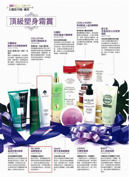 如新公司產品美體精華液入圍臺灣BODY雜志4月號2012金纖大賞前10強。