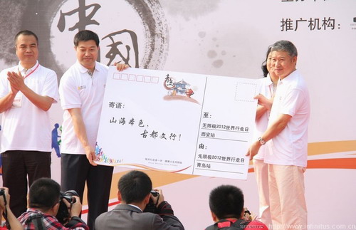 作為無限極2012世界行走日(中國)活動的新亮點,明信片已成為了每站傳遞健康傳遞愛的見證。在近萬名行走市民的見證下,青島市組委會代表于良仁先生向西安市人民政府副秘書長焦維發先生遞交了寄語“山海本色,古都文行”的明信片。而當西安市人民政府副秘書長焦維發先生向無限極2012世界行走日(中國)活動下一站蘇州市的代表——我司業務部總經理薛守春先生遞交寄語“長安姑蘇山水同秀,綠色健康你我同行”的明信片時,全場響起了經久不息的熱烈掌聲。