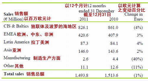 總銷售額的58%來自所謂的“顯露的市場”–西歐、美國、加拿大、澳洲、及日本以外的全球其他市場。