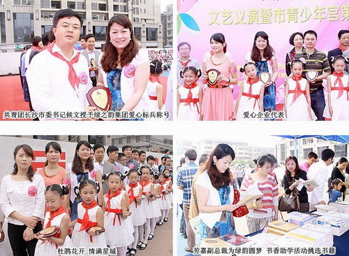 2012年5月26日,第三屆“杜鵑花開•情滿星城”大型公益活動在長沙青少年文化宮舉行。本次活動由長沙市委組織部、市委宣傳部、市文明辦、市少工委、團市委、市教育局、《長沙晚報》報業集團、市廣播電視臺聯合舉辦,市青少年宮、市青基會共同承辦。團省委副書記羅瓊、副市長、市少工委主任夏建平等與200多名孤殘兒童、特困農村留守兒童、農民工子女提前慶祝六一兒童節。綠之韻集團慈善基金捐贈十萬元愛心款項定向幫扶孤苦兒童、留守兒童。綠之韻集團董事常務副總裁勞嘉女士代表公司參與此次活動并接受“愛心標兵”榮譽牌匾。