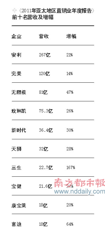 《2011年亞太地區(qū)直銷(xiāo)業(yè)年度報(bào)告》顯示,安利、完美、無(wú)限極分別以267億、120億和81億的營(yíng)收,21%、14%和47%的增速位列前三名,玫琳凱、新時(shí)代、天獅、三生、寶健、康寶萊、富迪則以75.3億、36.4億、32億、22.7億、21.6億、18億、18億占位前十。而最早拿牌的雅芳大跌52%,僅有10億營(yíng)收,跌至第15名,葆嬰和哈藥也分別跌去8%和94%,成為除廈門(mén)金日、安然、炎帝、愛(ài)茉莉幾家新拿牌無(wú)同比漲跌幅企業(yè)之外,僅有的三家負(fù)增長(zhǎng)公司。