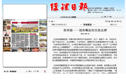 6月21日,中國唯一國內(nèi)外公開發(fā)行、直接面向全國廠長經(jīng)理、企業(yè)經(jīng)營管理人員、政府經(jīng)濟(jì)主管部門的國家級大型經(jīng)濟(jì)類報(bào)刊《經(jīng)理日報(bào)》日前對致明德韓國榮耀之旅活動(dòng)進(jìn)行了跨版、大篇幅的特別報(bào)道。同時(shí)該報(bào)還以“致明德——強(qiáng)勢崛起的民族品牌”為題,系統(tǒng)的以致明德此次韓國榮耀之旅為例,從文化體系、價(jià)值體系、營銷體系、戰(zhàn)略體系等四個(gè)維度分析企業(yè)品牌速成的動(dòng)因。