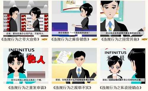 規則教育宣傳動畫,選取部分業務市場中常見多發案例作為題材,對實際推廣業務過程中背離規則的行為進行剖析,采用新穎、生動、易于理解的形式,拉近了我們與規則的距離。第一批共三部宣傳動畫(《違規行為之重復申請》、《違規行為之報單不實》、《違規行為之私設經銷點》)于2011年10月推出后,在廣大業務伙伴間獲得了良好的反響。