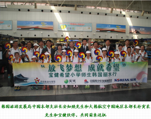 8月6日,由寶。ㄖ袊┤沼闷酚邢薰竞晚n國旅游局聯合主辦、中國青少年發展基金會和大韓航空給予支持的“放飛夢想 成就希望”寶健希望小學師生赴韓國參加麗水世博之行正式啟程!