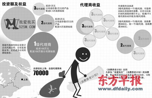 目前,上海家帝豪公司旗下“我愛我買”網站在全國有代理商7萬余名,消費者5萬余人。 曹建華向消費者承諾可通過消費“返利”形式,來實現個人養老計劃。劉建平 制圖