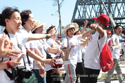 遠(yuǎn)處一行人吸引了很多人的目光,他們一路上載歌載舞,顯得活力十足。行走的過程不斷有路人加入他們行列。了解得知,他們來自一個(gè)單位,辦公室是7樓8號(hào),所以一行人取了一個(gè)名字叫“708大學(xué)”。組織人王先生介紹,他們經(jīng)常會(huì)組織這樣的活動(dòng),到全國各地參加活動(dòng),他們的口號(hào)是:一切行動(dòng)聽指揮,說積極話、做積極的事。