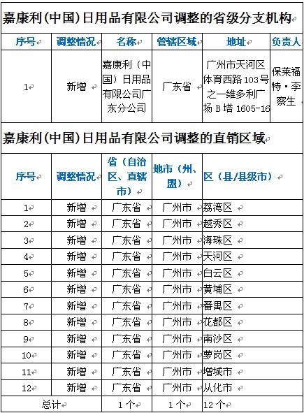 2012年10月23日,商務部直銷行業管理信息系統網站公布了嘉康利(中國)日用品有限公司調整直銷區域的信息。廣東省分公司成立,直銷區域新增廣州市12區。