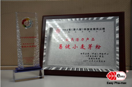 2012年12月6日,在由世界直銷(中國)研究中心、《中國直銷》雜志、直銷百科網聯合舉辦的第八屆中國直銷風云榜中,易健小麥芽粉憑借著獨特的產品特性和良好的群眾口碑,贏得了評審嘉賓的一致好評,被授予“最具潛力產品”獎。