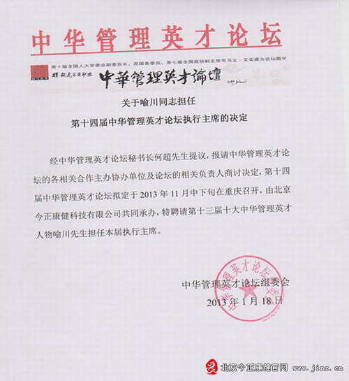 “第十四屆十大中華管理英才人物執行主席邀我擔任執行主席,我只給他們說了一個條件——第十四屆十大中華管理英才論壇必須在重慶召開。”2013年1月12號,推掉了總理設宴的喻川總裁風塵仆仆地從機場來到了今正康健“善行天下 德耀中華”的會場,告知了今正家人們如上對話。6日之后,好消息如期而至。