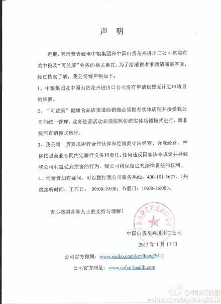 2013年1月17日,中糧集團(tuán)中國山貨花卉進(jìn)出口公司發(fā)布了關(guān)于“可益康”業(yè)務(wù)的重要聲明,文中表示中糧集團(tuán)及中國山貨花卉進(jìn)出口公司沒有申請也暫無計劃申請直銷牌照。
