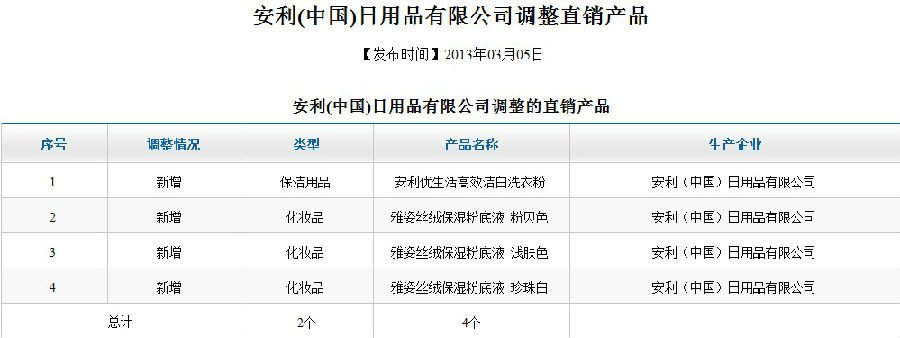 直銷道道網訊,商務部直銷行業管理信息系統3月4日公布安利公司直銷產品調整信息,新增化妝品和保潔用品共4款。目前,安利直銷產品涉及全部五個直銷產品類別,新增后產品將達到336種,也是中國市場直銷產品最多的企業。