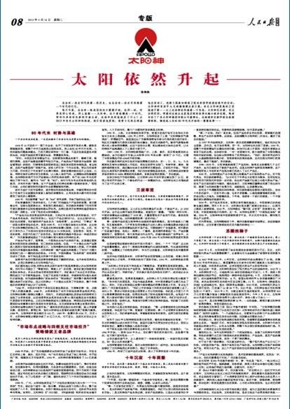 2013年04月16日,《人民日報海外版》以此開篇,對太陽神25年來的風雨征程進行了整版大篇幅的報道,并對太陽神強勁的發展勢頭給予了高度肯定。其對太陽神的關注,也是消費者對太陽神的信賴,是社會各界對太陽神的認同,必將喚起更多的國人對太陽神品牌的濃厚記憶。