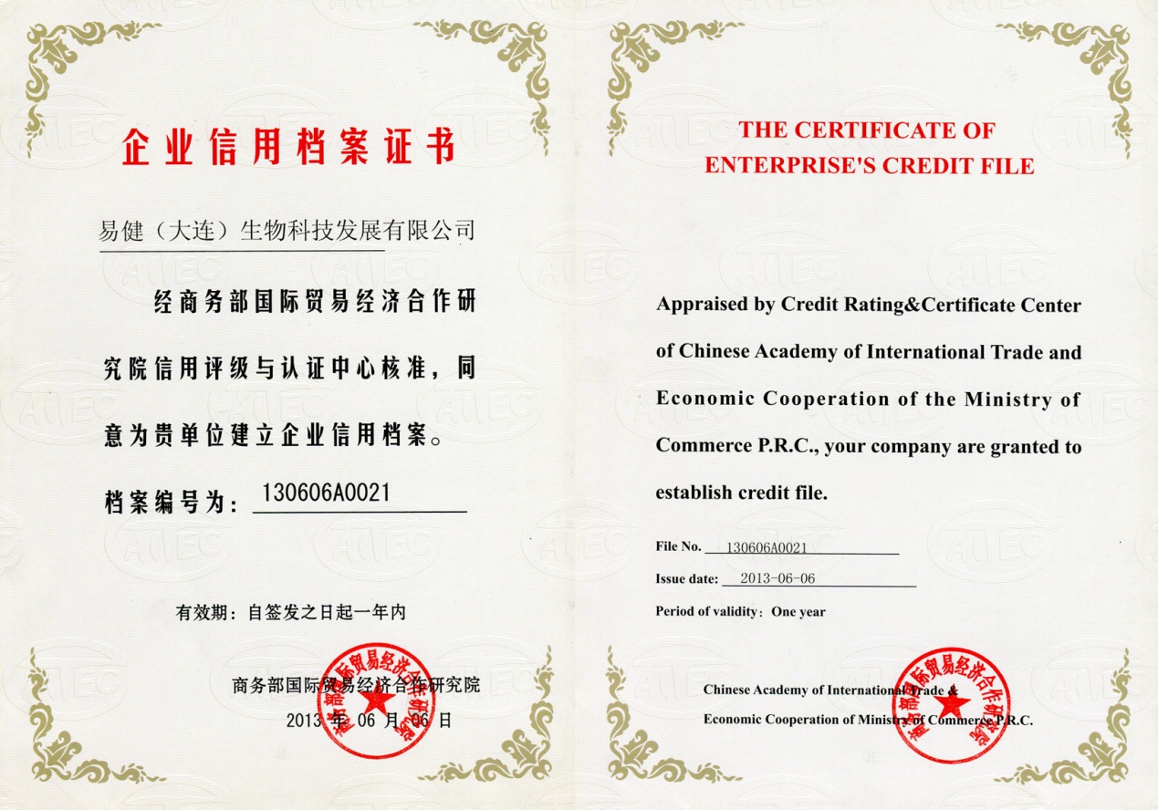 經商務部國際貿易經濟合作研究院信用評級與認證中心核準,于2013年6月6日為大連易健集團旗下子公司大連易健生物科技發展有限公司建立企業信用檔案。