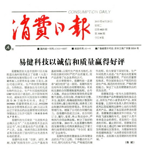 2013年6月25日,《消費日報》綜合報道大連易健科技以誠信和質量贏得好評。