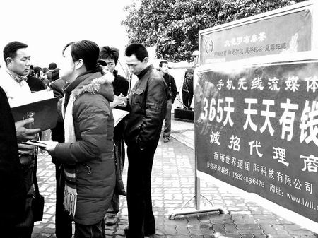 “第三方埋單”的理論無(wú)懈可擊。一位代理商給與會(huì)者看了一個(gè)令人熱血沸騰的視頻:比爾·蓋茨把5間屋子大的計(jì)算機(jī)搬到辦公桌上,成就了他的世界首富夢(mèng)。今天世界通總裁戴兵把桌子上的電腦搬到手機(jī)上,實(shí)現(xiàn)兩網(wǎng)合一,還把廣告搬到手機(jī)上播放,打造一個(gè)無(wú)線流媒體世界老大,IT行業(yè)與手機(jī)廣告業(yè)兩個(gè)金礦加在一起,你想他將會(huì)成為什么呢?如果你跟著他走會(huì)成為什么呢?不用腦袋想,用你的腳指頭想就可以得到結(jié)果……培訓(xùn)效果可以想見(jiàn),不少人紛紛表示愿做代理商看廣告掙大錢。據(jù)了解,世界通在我省發(fā)展代理商速度很快,參與人員不少。河南移動(dòng)一位人士對(duì)全省不少手機(jī)店加盟世界通十分擔(dān)心:“不知這是禍?zhǔn)歉!U?qǐng)大河報(bào)予以高度關(guān)注。”