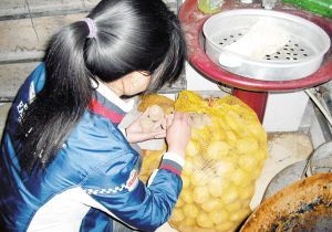 下午4時30分許,客廳里用四個塑料凳支撐一塊長方形的板子,當做臨時飯桌。正式開飯了(既是午餐又是晚餐),飯桌上擺上了17個飯碗和兩個大鐵盤,一個大鐵盤子里裝著半盤蘿卜燉土豆,另一個大鐵盤盛著菠菜湯,菜湯里連油珠都看不到。這時,操著東北口音、自稱安徽阜陽的寢室長劉某開始發令:“下面,各位依次作自我介紹。”等到每個人介紹完,劉某從座位上站起來,手拿一個大鐵勺,依次給大家盛菜盛湯,每個人都自覺地雙手捧著飯碗接過湯菜,同時口里還大聲喊著“謝謝領導”。“現在開始吃飯。”隨著劉某再次一聲令下,大家才開始吃飯。一位來自河南的男子看著盤子里的菜,只吃了幾口便放下了碗筷。旁邊的老鄉見狀,趕緊將剩下的飯菜分給了旁邊的幾位男女。10多分鐘后,所有人的飯碗全都干干凈凈。